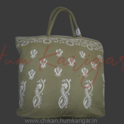 This olive green handbag stands out with its unique all-over embroidered motifs and a detailed chikankari border. The soft jute-cotton texture complements the intricate white patterns beautifully. It exudes sophistication, making it ideal for both casual and semi-formal use. A classy pick that elevates any look with its earthy elegance.