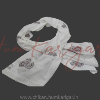 This cotton scarf is decorated with intricate paisley chikankari embroidery in black, beautifully balanced on a white base. The delicate lace border at the ends adds a touch of sophistication and fine detail. Elegant and timeless, it can be paired effortlessly with both ethnic and modern outfits. A graceful style statement with a refined edge.
